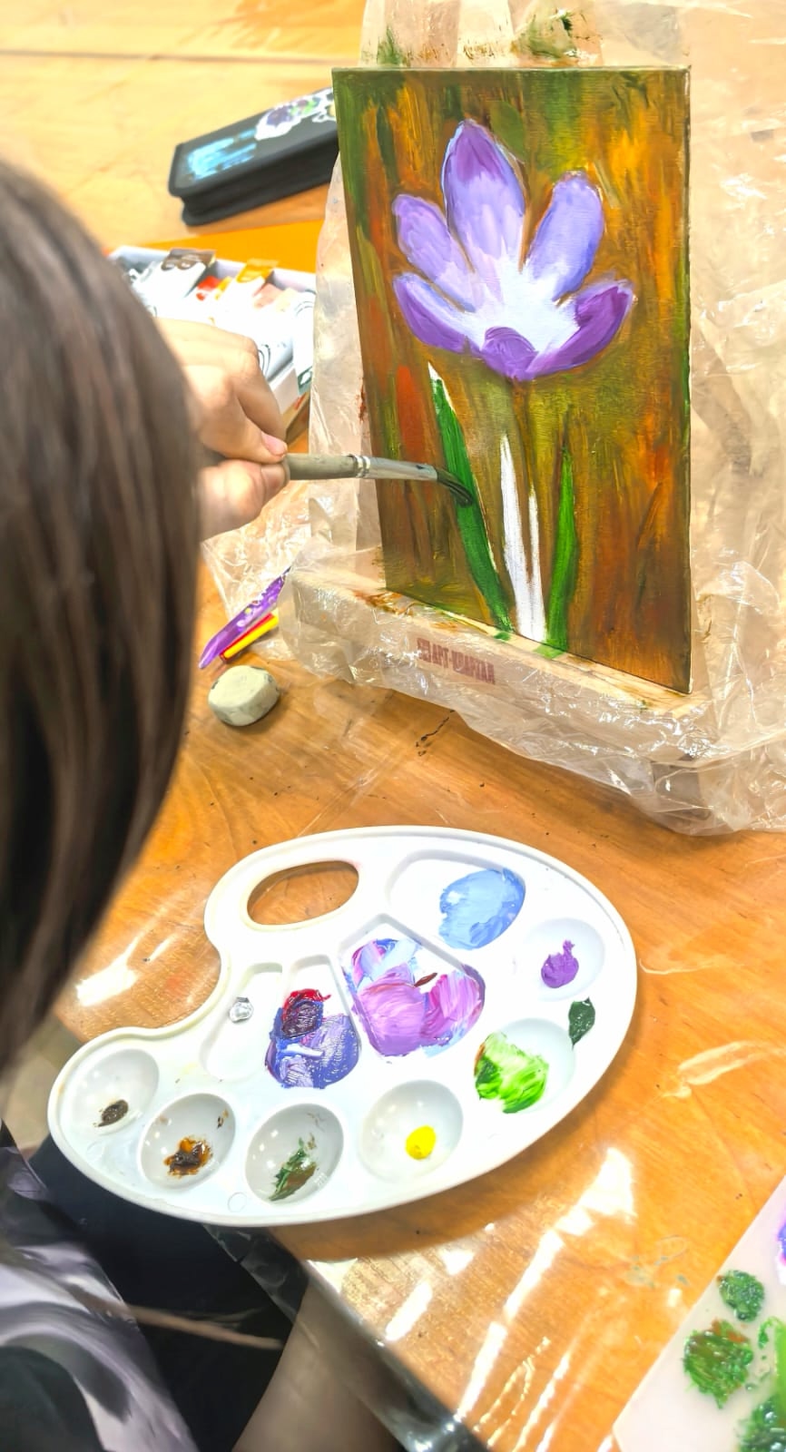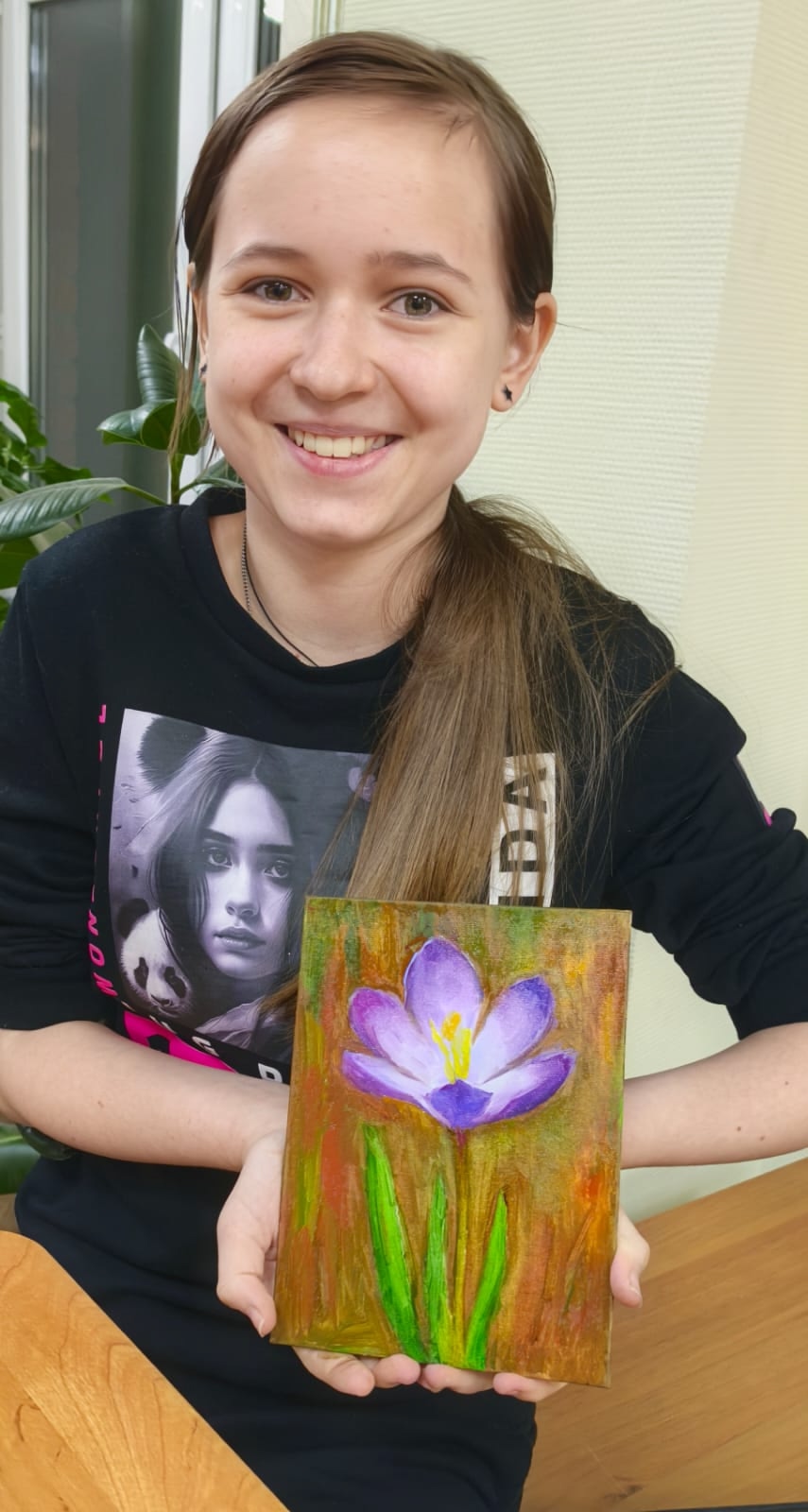 Алиса написала свою первую работу в технике масляной живописи всего за 2 часа. Цветок крокуса получился нежным и сияющим. Мало кому удается сразу избежать грязных оттенков, разбелённости и написать свою первую работу с таким художественным вкусом! Но Алиса внимательно слушала все объяснения и советы, и у нее получилось. Браво, Алиса!