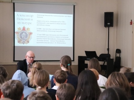 Рассказ А.А. Черёмина сопровождался тематическими слайдами и фрагментами фильма Сергея Эйзенштейна «Александр Невский» (1938 г.).