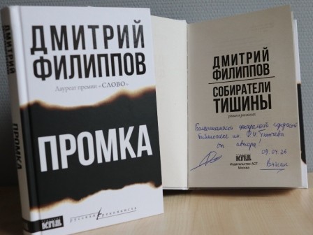 А ещё – сегодня библиотечный книжный фонд пополнился новыми книгами, которые подарила библиотеке Наталья Юрьевна. Это книги лауреата премии «СЛОВО», представителя новой военной литературы Дмитрия Филиппова «Собиратели тишины» и «Промка» с автографом автора.