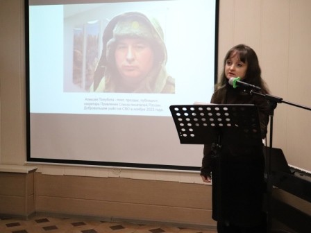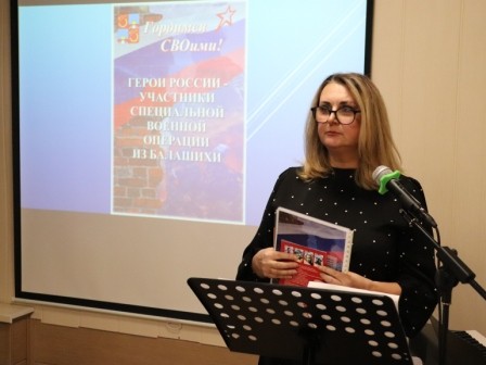 С обзором новой фронтовой литературы-произведений участников СВО и хроники СВО на страницах газеты «Город Балашиха» выступила Л.Н. Бурмисова, главный библиограф; обзор Z-поэзии сделала Л.А. Сорокина, зав. библиотекой; экспозицию «Герои России-участники СВО из Балашихи» представила И.А. Губкина, главный библиотекарь. О проекте «За Веру и Отечество», включающем издание сборника патриотической лирики, рассказал автор-составитель, член ЛИТО «Метафора» Р.В. Романов. Страничку памяти известного поэта А. Полуботы, не раз бывавшего на мероприятиях в Балашихе, который погиб в ходе СВО, подготовила Е.А. Темченко, автор арт-проекта «Поэзия жизни».
