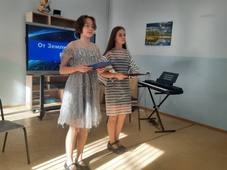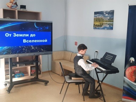 Учащиеся ДШИ № 5 исполнили ряд музыкальных произведений, динамичных и экспрессивных, вполне соответствующих космической тематике. Преподаватель И. Н. Гончаренко поделилась своими воспоминаниями о встречах с известными космонавтами.